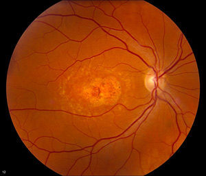 (یا: دژنراسیون ماکولا[۱]، فندوس فلاویماکولاتوس[۲]، اشتارگات ماکولا[۳]) بیماری ارثی چشمی. باعث تار دیدن و نابینایی بر اثر اختلال در عملکرد بخشی از شبکیه به نام لکه زرد (ماکولا[۴]) میشود. این لکه، واضح و درستسازی نور و پردازش دید را به وسیلۀ سلولهای حساس به نور انجام میدهد. گاه این سلولها تخریب شده و دیستروفی ماکولا[۵] یعنی اختلال در جذب مواد ضروری و دفع پسماندها در سلولها یا دژنراسیون ماکولا یعنی ناتوانی سلولها در انجام وظیفه پدید میآید. ناتوانی و تخریب ماکولا علتهای مختلف دارد. بیماری اشتارگات یکی از آنهاست و باعث ناتوانی سلولها در دفع پسماند ویتامین ای (یا هیدروژن) بر اثر جهش ژنی ایبیسیای[۶] میگردد. انباشت مواد زائد (یا لیپوفوشین[۷]) به اختلال در کارآیی ماکولا و شبکیه منجر خواهد شد؛ زیرا ژن منتقل شده از پدر و مادر، بر اثر جهش، معیوب و نارسا شده و این نارسایی ژنی موجب ناتوانی سلول در دفع هیدرژن باقیمانده از سوخت ویتامین اِی میگردد. افزایش پسماند به مرور، تاری دید و نابینایی را به همراه دارد. ویتامین اِی، منبع غذایی ضروری برای سلولهای گیرندۀ نور است. این بیماریِ ارثیِ پیشرونده که خردسالان تا بزرگسالان (بهویژه 6 تا 20سالگی) را شامل میشود، نادر است. وقتی منتقل میشود که پدر و مادر حامل این ژن باشند. به همین دلیل در ازدواج فامیلی، امکان این بیماری بیشتر است؛ اما پدر و مادر مبتلا به این بیماری تا 25درصد ممکن است فرزندانشان هم بیمار شوند. فراوانی آن یک در 20,000 است. به هر دو چشم آسیب میرساند.