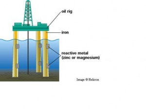 جلوگیری از زنگزدگی. دو روش عمده برای جلوگیری از زنگزدگی بهکار میرود. در روشهای سدی[۴]، سد یا مانعی را بین فلز، هوا، و رطوبت قرار میدهند تا امکان صورتگرفتن واکنش کاهش یابد. این روش رایجترین روش جلوگیری از زنگزدگی است. انواع موانع مصرفی عبارتاند از لایهای از گریس، رنگ، پلاستیک یا فلزی غیرفعال مثل قلع، مس یا کروم. در روش محافظت فداشدن[۵]، عملاً آهن را با فلزی مقاوم در برابر اکسایش مثل روی میپوشانند (رویاندودکردن[۶]) یا به فلزی بسیار فعال مثل منیزیوم وصل میکنند. تا زمانی که فلز «فداشونده» باقی است، خورده میشود و آهن سالم باقی میماند. فلز فداشونده[۷] برای محافظت از لولهها و فلزاتی بهکار میرود که در معرض هوا قرار دارند و در تجهیزات نفتی نیز برای جلوگیری از خوردگی و زنگزدن از آن استفاده میکنند. فلزی فعالتر از آهن، مثلاً روی یا منیزیوم[۸]، را بهشکل کلوخه با سیم به لوله وصل میکنند. الکترونهای آزادشده در واکنش از طریق سیم بهطرف لوله حرکت و از زنگزدن آن جلوگیری میکنند. تعویض فلز فداشونده ارزانتر از تعویض لولههاست.