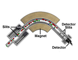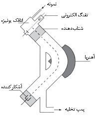 در فیزیک، وسیله‌ای برای تجزیه و تحلیل ترکیب شیمیایی. یون‌های مثبت یا ذرات باردار مادۀ مورد نظر را با سامانه‌ای الکترومغناطیسی ازهم جدا می‌کنند و شرایطی فراهم می‌آورند که ذراتی با جرم‌ یکسان در نقطۀ خاصی متمرکز و آشکارسازی شوند. به این ترتیب، اندازه‌گیری دقیق تراکم یا غلظت نسبی جرم‌های یونی، و به‌ویژه جرم ایزوتوپ[۱]ها امکان‌پذیر می‌شود.