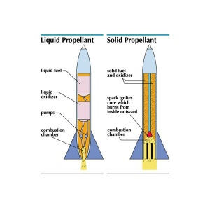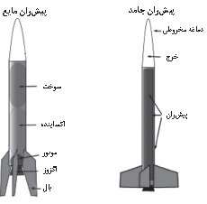 مادۀ سوختنی موشک برای پیشرانی آن. معمولاً از دو نوع عامل پیشران استفاده میکنند: عامل اکساینده[۱] و سوخت[۲]. این دو در مخزنهای جداگانه ذخیره میشوند و مستقلاً با تلمبه به داخل محفظۀ احتراق انتقال مییابند. اکسیژن مایع (عامل اکساینده) و هیدروژن مایع (سوخت) عاملهای پیشران متداولاند و در موتورهای اصلی شاتل فضایی نیز بهکار میروند. خرج منفجرهای[۳] که پرتابهای را از سلاح بیرون میپراند نیز عامل پیشران است.