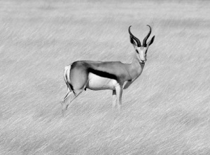 آنتلوپ[۱] جنوب افریقا Antidorcas marsupialis. بلندی این جانور تا شانه حدود ۸۰ سانتیمتر است و طول سر و بدنش به ۱.۳ متر میرسد. این آنتلوپ یا غزال ممکن است هنگام رمیدن یا بازی، سه متر یا بیشتر جهش کند. این غزال در ناحیۀ میانی پشتی چین پوستیای دارد که بههنگام اعلام خطر مانند تاج ایستاده قرار میگیرد. غزال افریقایی زمانی در گلههایی با بیش از یک میلیون رأس مهاجرت میکرد، اما اکنون فقط به تعداد اندک و در مناطق حفاظتشده یافت میشود.