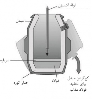 متداولترین روش فولادسازی. در این روش اکسیژن را با فشار زیاد به داخل چدن خام[۱] مذاب میدمند. چدن خامی را که از کورۀ بلند خارج میشود، با قراضۀ فولاد[۲] در مبدّل (کنورتُر)[۳] میریزند و سپس، جریان پرفشار اکسیژن را بهآن تزریق میکنند. کربن اضافی مخلوط و ناخالصیهای دیگر بهسرعت میسوزد و سرباره[۴] را تشکیل میدهد. سپس، کنورتُر را کج میکنند تا فولاد مذاب از آن تخلیه شود. با این فرآیند، تولید ۳۵۰ تن فولاد از چدن خام مذاب، فقط ۴۵ دقیقه طول میکشد. فرآیند اکسیژن قلیایی در یک کارخانۀ فولادسازی در نزدیکی شهرهای لینتس[۵] و دوناویتس[۶] اتریش ابداع شد (۱۹۴۸) و در واقع نوعی فرآیند بسمر[۷] است.