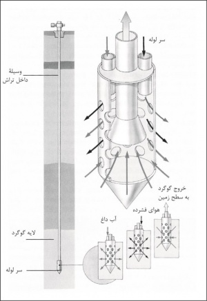 فرآیند استخراج گوگرد از نهشتههای زیرزمینی. سه لوله، یکی در داخل دیگری، تا زیر لایۀ گوگرد در زمین فرو برده میشوند و آب داغ تحت فشار را، در دمایی بالاتر از دمای ذوب گوگرد، از طریق لولۀ بیرونی، و هوای فشرده را از طریق لولۀ داخلی به لایۀ گوگرد تزریق میکنند. آب داغ گوگرد را ذوب میکند و هوای فشرده آن را از طریق لولۀ میانی بهطرف سطح زمین میراند.