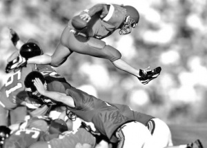 نوعی ورزش برخوردی مشابه راگبی انگلیسی. بین دو تیم یازده نفره با توپ تخممرغیشکلی باددار بازی میشود. بازیکنان از کلاه ایمنی و لباس محافظدار استفاده میکنند. سوپر جام[۱] آن اولینبار در ۱۹۶۷ برگزار شد و در حال حاضر سالانه بین دو تیم برندۀ کنفرانس فوتبال امریکایی و کنفرانس فوتبال ملی برگزار میشود. بازی در زمینی بهطول ۹۱ متر برگزار میشود و در طول زمین خطوطی به موازات هم وجود دارد که زمین را مشبک میکند. در دو انتهای زمین دو خط ۹ متری وجود دارد که پشت آنها دیرکهای دروازهها قرار دارد. بازی در چهار زمان ۱۵ دقیقهای برگزار میشود. امتیاز زمانی داده میشود که توپ با پاس یا دویدن با آن از خط انتهایی زمین عبور داده شود (تاچ داون[۲]، شش امتیاز)؛ یا بعد از یک تاچدان از روی دیرک افقی دروازه با شوت عبور کند (یک امتیاز)؛ یا از داخل میدان در حین بازی بهسمت دروازه شوت شود (سه امتیاز)؛ یا یک مدافع صاحب توپ در ناحیه انتهایی تکل[۳] شود و یا با سدکردن شوت یک تیم بهنحوی که توپ از انتهای زمین خارج شود (دو امتیاز). هر تیم دارای بیش از ۴۰ بازیکن است ولی یازده بازیکن در داخل زمین بازی میکنند. تیم مهاجم به رهبری کوارتربک[۴] خود کوشش میکند که با دویدن با توپ یا پاسدادن به یک بازیکن در موقعیت مناسب توپ را به جلو ببرد. تیم صاحب توپ باید در چهار تلاش خود توپ را دستکم ۹ متر به جلو ببرد تا بار دیگر فرصت اولین داون[۵] را بهدست آورد، در غیر این صورت باید توپ را به تیم مقابل واگذار کند.