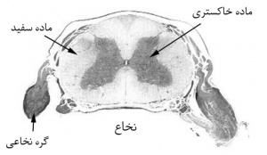 بخشهایی از مغز و نخاع[۱]. این بخش از جسم سلولی یاختههای عصبی بسیار متراکم و مرتبط به هم ساخته شده است. لایههای بیرونی مخچه[۲] شامل بیشترین میزان مادۀ خاکستری مغزند. این بخش عهدهدار اعمال ذهنی پیشرفته است. همچنین، بخش مرکزی طناب نخاعی را مادۀ خاکستری تشکیل میدهد. به خلاف مادۀ خاکستری، مادۀ سفید از آکسون[۳]های یاختههای عصبی ساخته شده است.