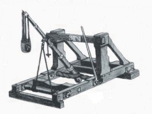 از سلاحهای جنگی قدیم. از کهنترین ماشینهای مکانیکی جنگی، که اختراع آن را به چینیها نسبت میدهند (بین قرن ۵ و ۳پم). منجنیق عبارت بود از یک تیر چوبی ستبر و محکم که به تسمه یا نواری منتهی میشد و حول محوری میچرخید و با پرتاب سنگ یا الوارهای سنگین یا تنۀ درختان که به نفت یا روغن آغشته بود، قلعه یا باروی محاصرهشده را ویران میکردند یا به آتش میکشیدند. این سلاح تا قرن ۱۴م (زمان پیدایش باروت و توپ) در محاصره بهکار میرفت. برخی از منجنیقهای نیرومند قادر بودند سنگهایی تا وزن یک تن را بهسوی هدف پرتاب کنند. در ایران علاوه بر منجنیق معمولی از سلاحی با همان مکانیسم، به نام کُشکَنجیر برای گشودن قلعهها بهوسیلۀ پرتاب سنگ یا تیرهای بزرگ و یا برای سوراخکردن باروها استفاده میشد. امروزه به نوعی جرثقیل سنگینوزن نیز منجنیق میگویند.