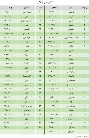 کشورهای اسلامی (عضو سازمان کنفرانس اسلامی) که شمارشان به ۵۷ کشور میرسد، به کشورهایی گفته میشود که بیشتر مردمان آن مسلمان باشند. تعداد مسلمانان جهان ۱.۵۷ میلیارد نفر (۲۰۰۹) برآورد میشود که ۸۵ درصدشان سنیمذهب و ۱۵درصد دیگر شیعهاند. امروزه کشورهای مسلمان عضو سازمان کنفرانس اسلامیاند که در ۱۹۶۹ به ابتکار عربستان سعودی در رباط (پایتخت مراکش) تشکیل شد. اهداف آن نیز ترویج همبستگی اسلامی، تحکیم همکاریهای اقتصادی، اجتماعی، و فرهنگی کشورهای عضو و حراست از اماکن مقدس اسلامی و استقلال مسلمانان است. این سازمان متشکل از ۵۷ عضو است که در هفت کشور اوگاندا، بِنین، سورینام، کامرون، گابون، گویان و نیجریه، اسلام دین اکثریت جمعیت آنها نیست.