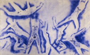 در ۱۹۵۸م در پاریس «نمایشگاهی» با دیوارهای خالیِ سفید برپا کرد، که بسیار مورد تحقیر و تحسین سههزار نفری قرار گرفت که از آن دیدن کردند. در اواخر دهۀ ۱۹۵۰م، نمایش مجموعۀ «قلمهای جاندار[۸]» را درپیش گرفت. نمایشی عمومی، که در آن مدلهای برهنه را واداشت تا با بدنهای آغشته به رنگ آبی بر روی بومهایی که روی زمین قرار داده بود، نقشهایی ایجاد کنند. کلاین نقاشیهای «قلمهای جاندار» را تنسنجیها[۹] نام نهاد.